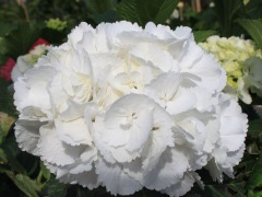 Листья овальные сочно-зеленого цвета. Белоснежные цветы собраны в округлые, соцветия до 15-20 см в диаметре. Универсальный сорт,легкий для выращивания.