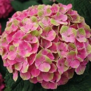 Гортензия Magical Crystal обладает удивительным свойством менять цвет лепестков в зависимости от времени цветения. Цветение начинается в июле с цветков нежно-розового цвета с мятой, а к сентябрю лепестки зеленеют, обретая розовую кайму. Шарообразные соцветия имеют диаметр 20 см.